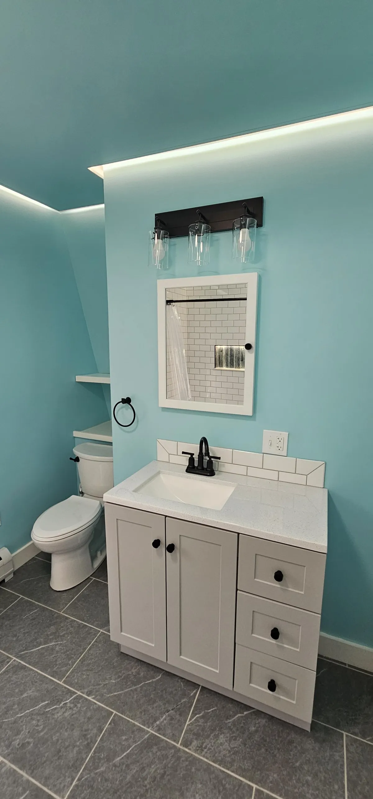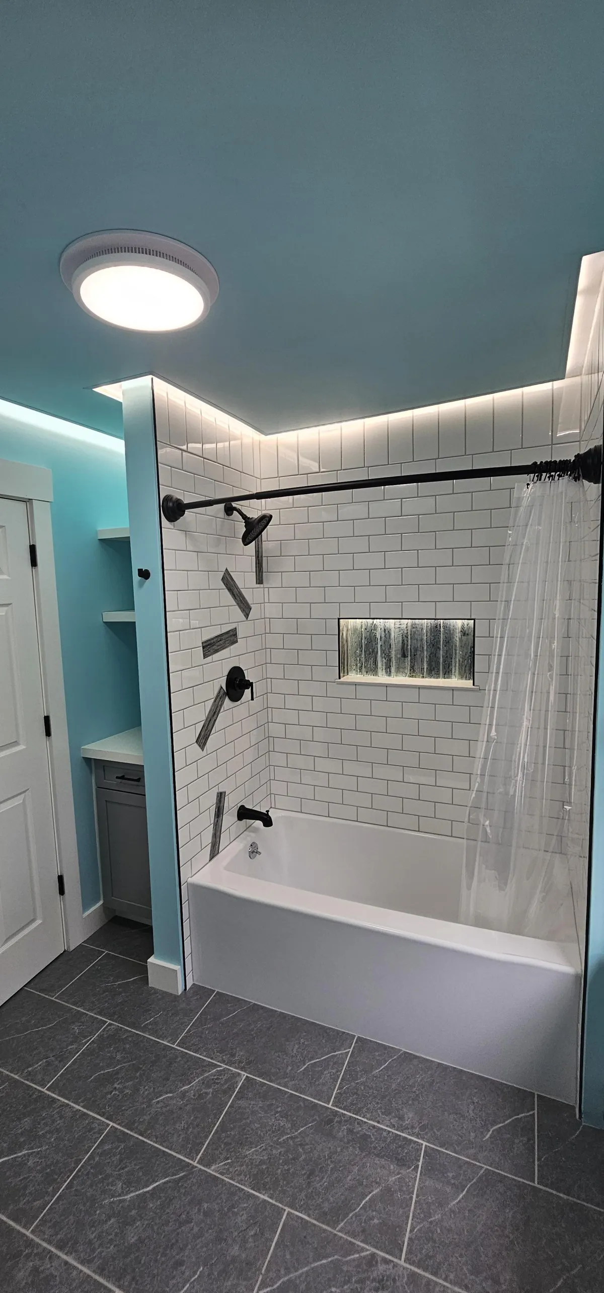 Partnering up with Cornerstone Contractors and Property Management the team has over 20 years experience in residential renovations. When you rent from us you not only get the craftmanship he and his team brings to the field. You get parts of his artistic eye and story imbedded in every renovation. This is a picture of a tub surround designed and tiled by the owner.